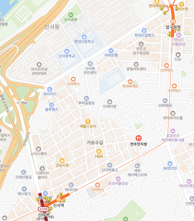 전주맛자랑 (https://naver.me/5XJy4ZQm), 3호선, 신분당선 신사역 8번 출구에서 625m