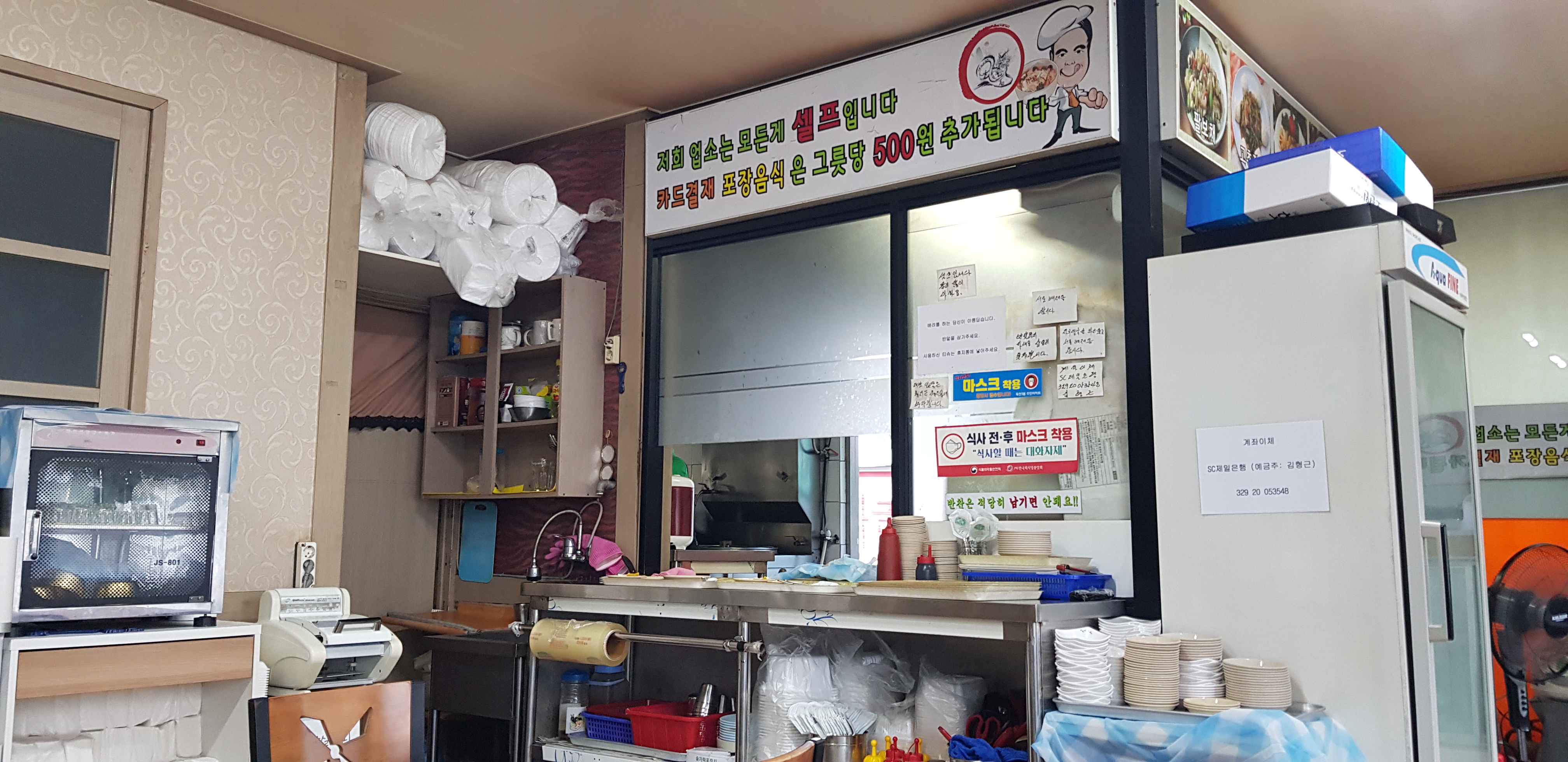 주문 후 조리가 완료되면 여사장님이 메뉴를 부른다. 위에 보이는 카운터에서 직접 받아오면 된다. 내부는 생각보다 테이블이 많다. 룸도 있지만 지금은 사용하지는 않는 듯 하다. 조리실이 잘 보이지는 않지만 청결해 보였다.