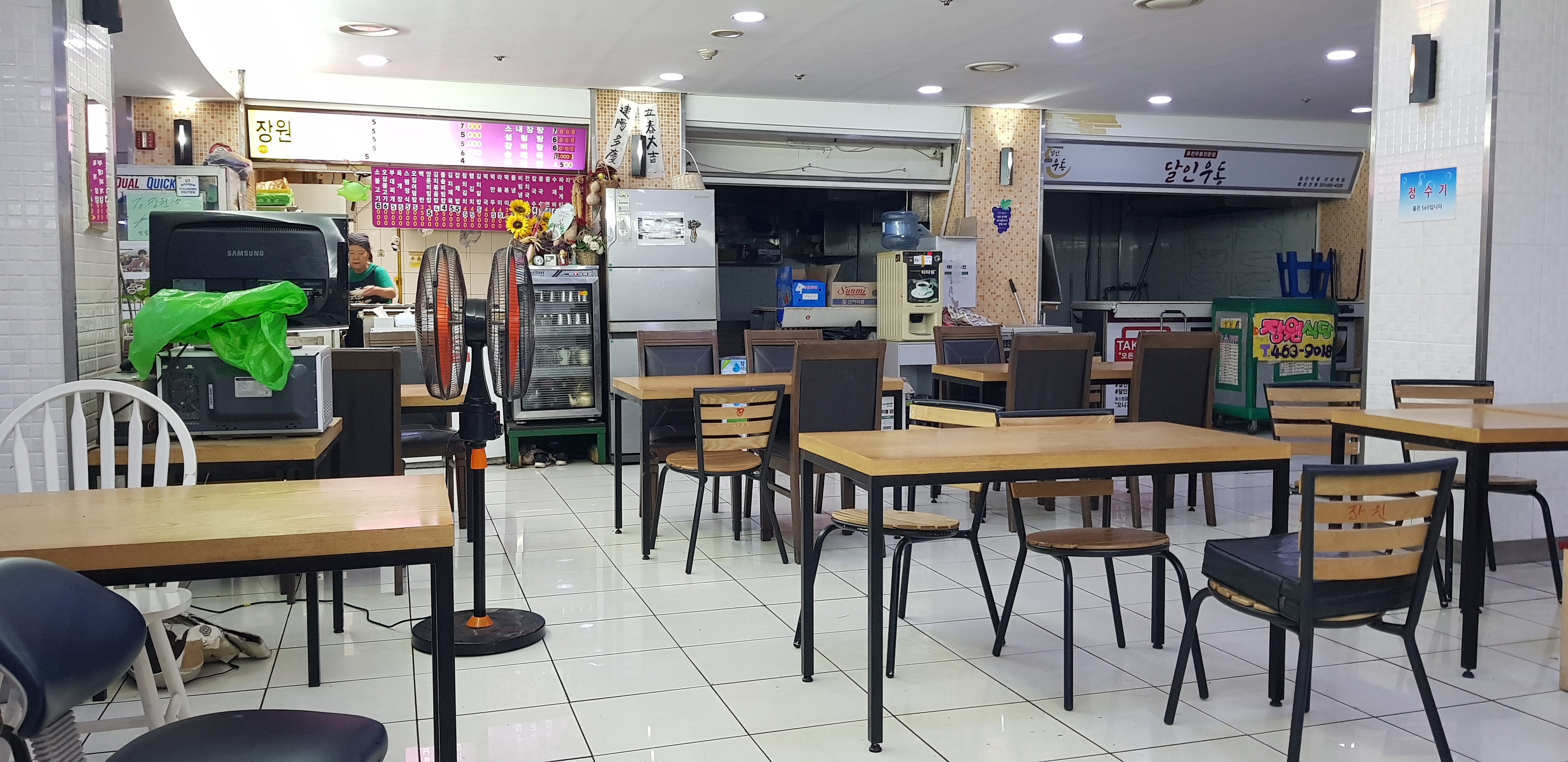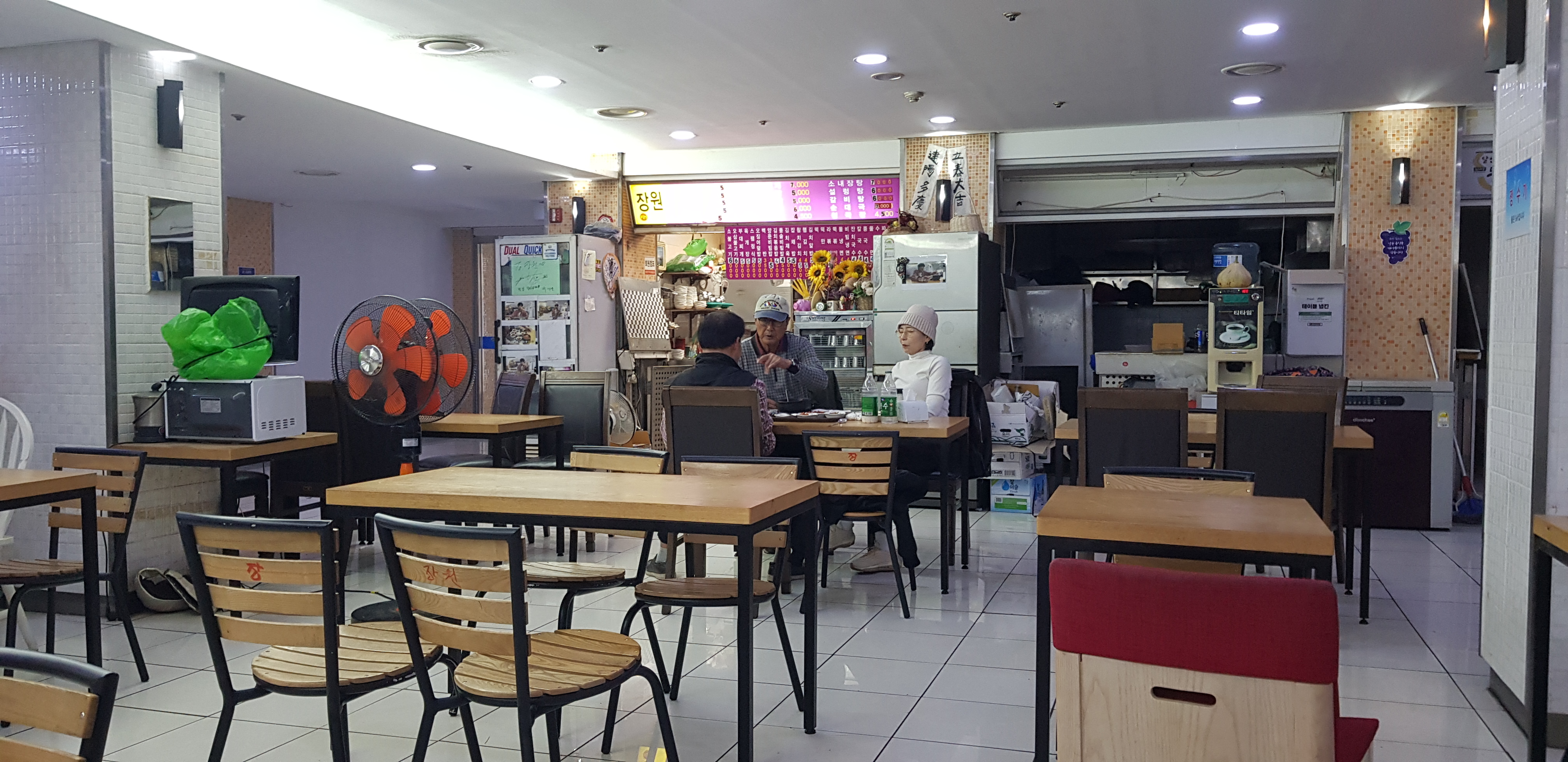 안양역 지하상가 푸드코트에는 현재 3~4개 가게가 운영 중이다. 그래서인지 조명이 부분적으로만 켜져 있어 전체적으로 분위기가 어둡다. 신기한 점은 식사를 끝낸 어르신들이 돌아가지 않고 그 자리에 앉아 커피를 마시거나 시간을 보낸다는 점이었다. 식사 테이블은 가게에서 관리하지 않는지 약간 더러웠고 식사 후 본인이 깨끗하게 치우는 것이 필요해 보였다.