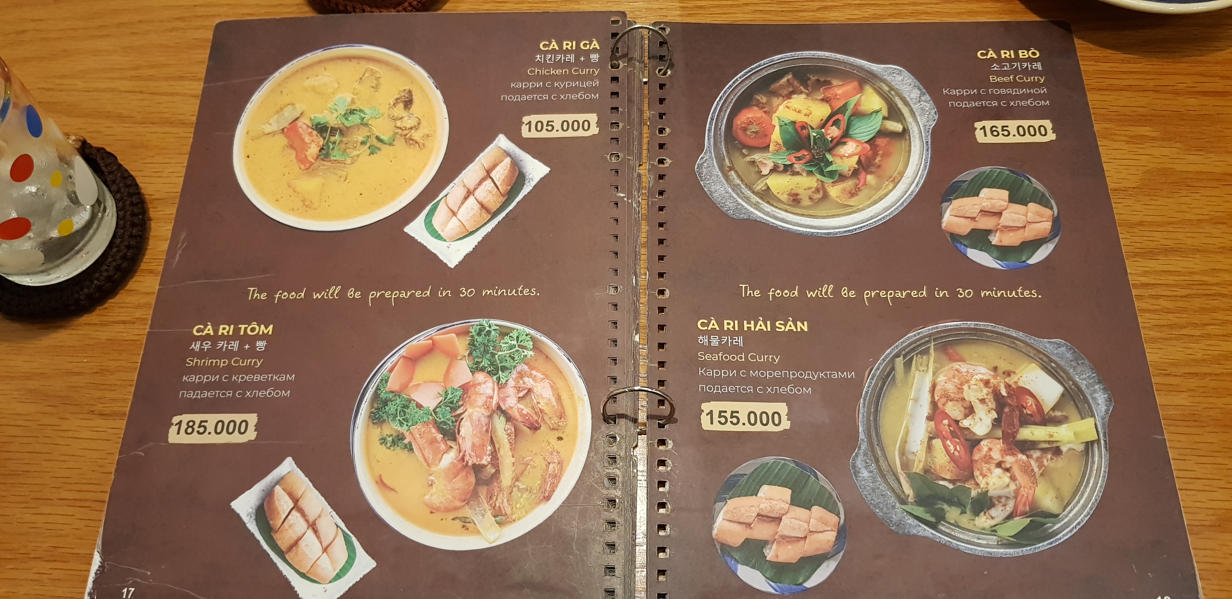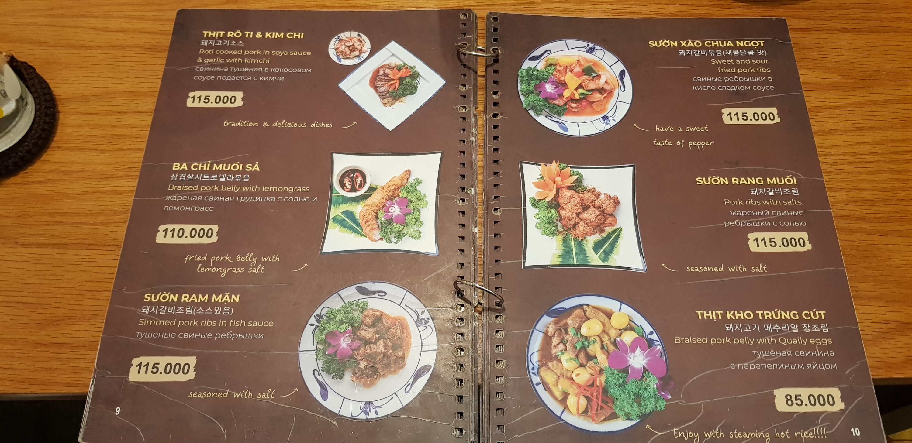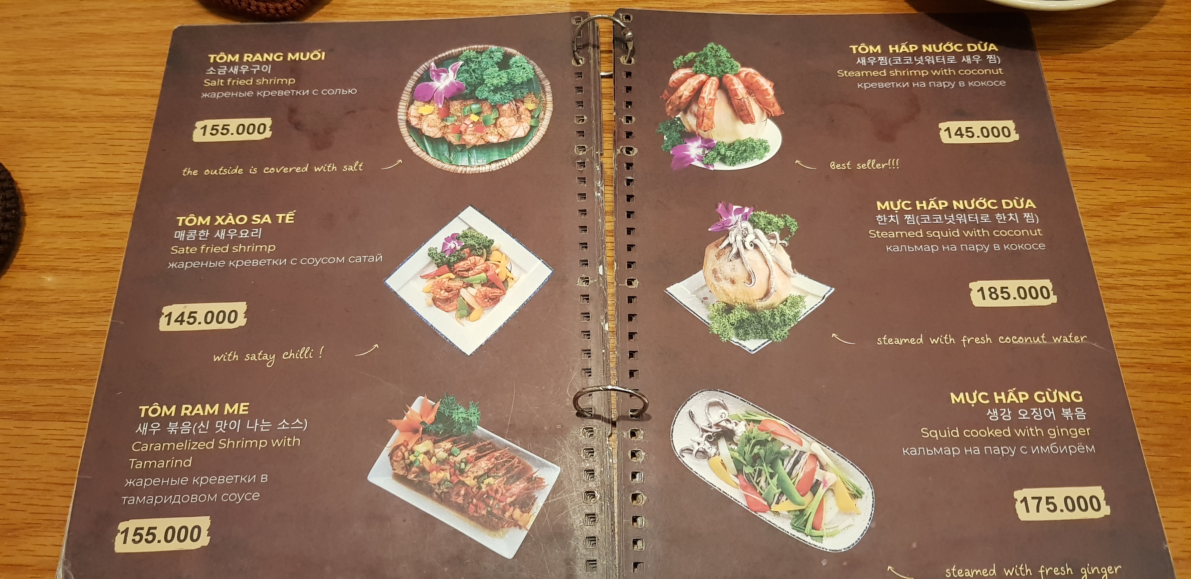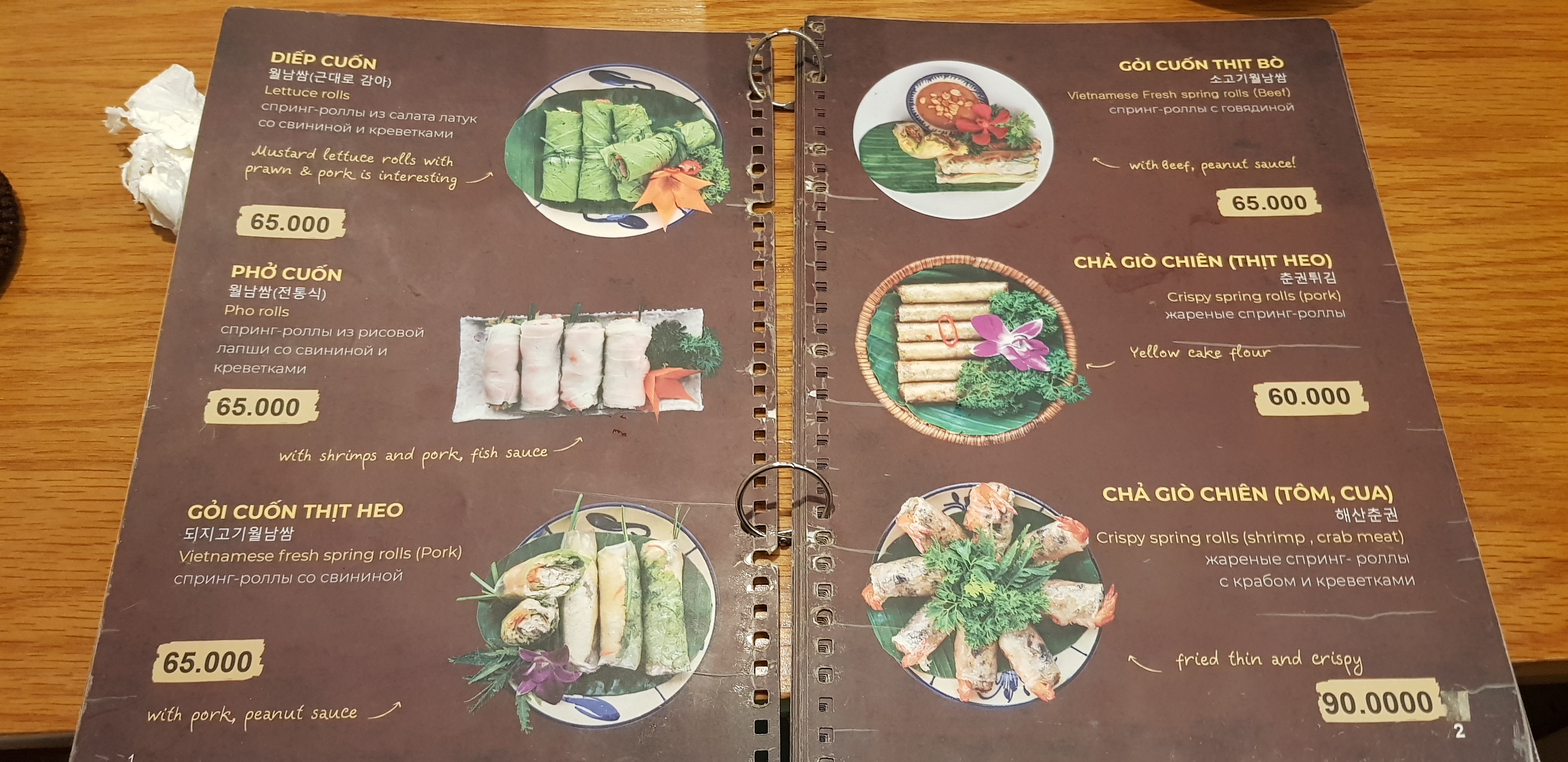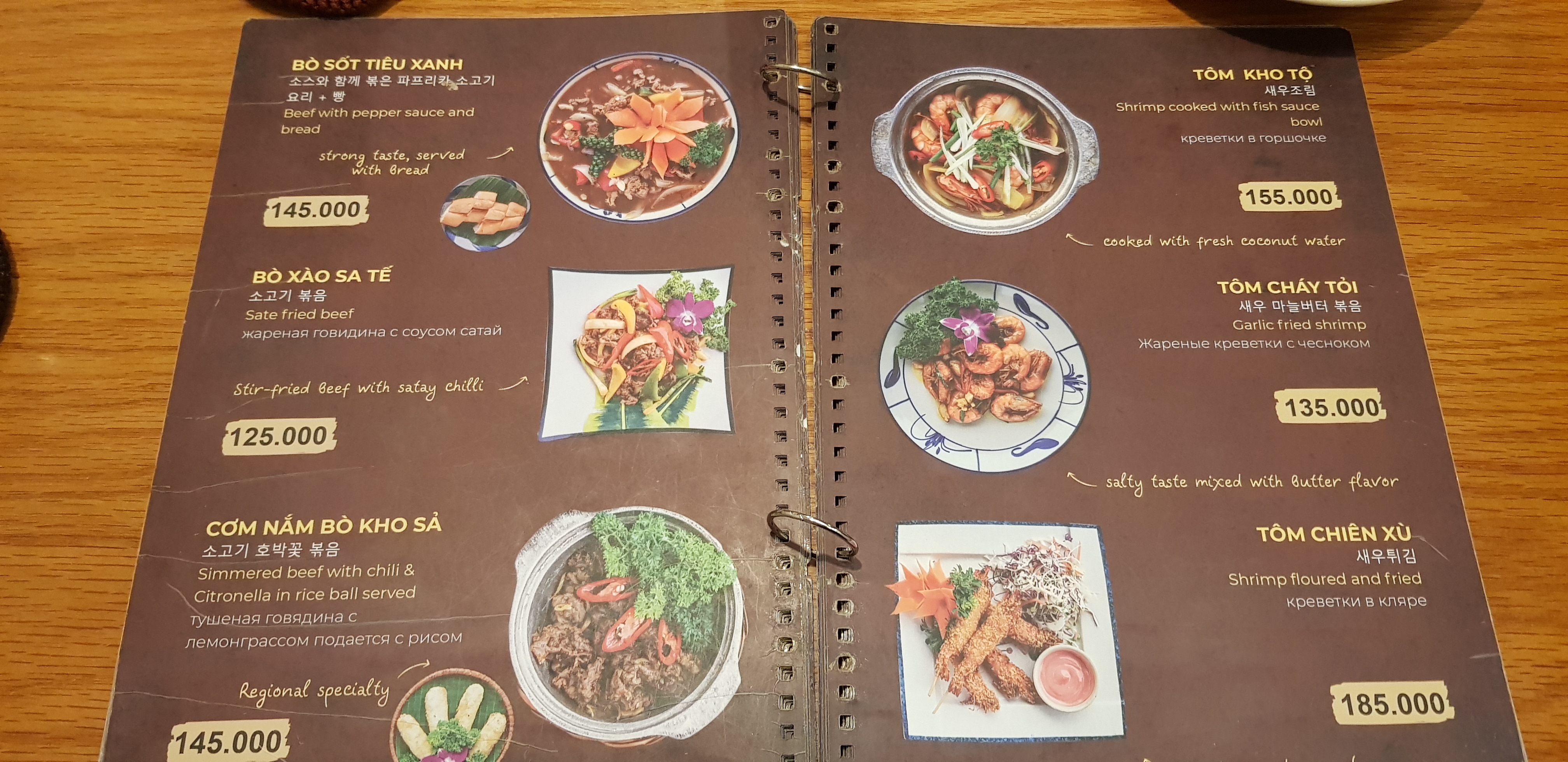 한국인 입맛에 잘 맞는 베트남 음식 위주로 메뉴가 잘 구성되어 있다. 가격은 저렴하나 전체적으로 양이 많지는 않다. 모닝글로리 볶음 맛있고 사진에는 없으나 '새우 마늘버터 볶음'도 괜찮다. 항아리 밥이 같이 나오기 때문에 볶음밥 메뉴는 안 시켜도 될 것 같다. 밥 양이 많고 한국 쌀밥 맛에 뒤지지 않는다. 볶음밥은 아무래도 시푸드 전문점 가게에서 파는 볶음밥이 맛있다. 베트남 부침개인 반쎄오도 입맛에 잘 맞는다. 주문하지는 않았지만 돼지갈비 조림(소스 있음)도 많이 시키는 메뉴이다.