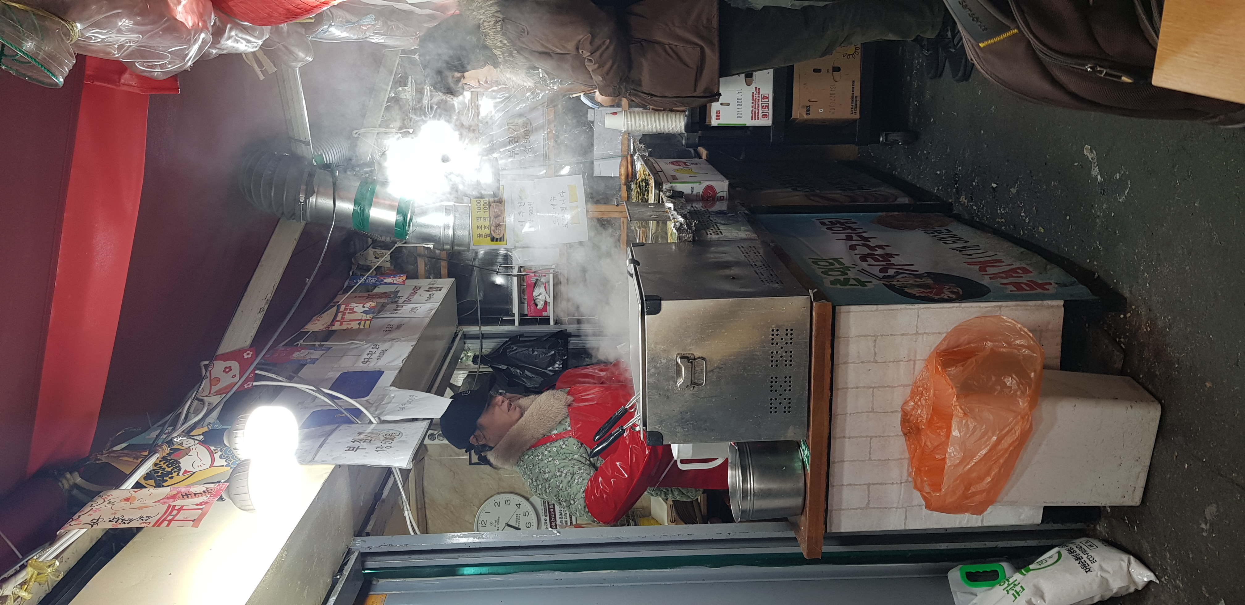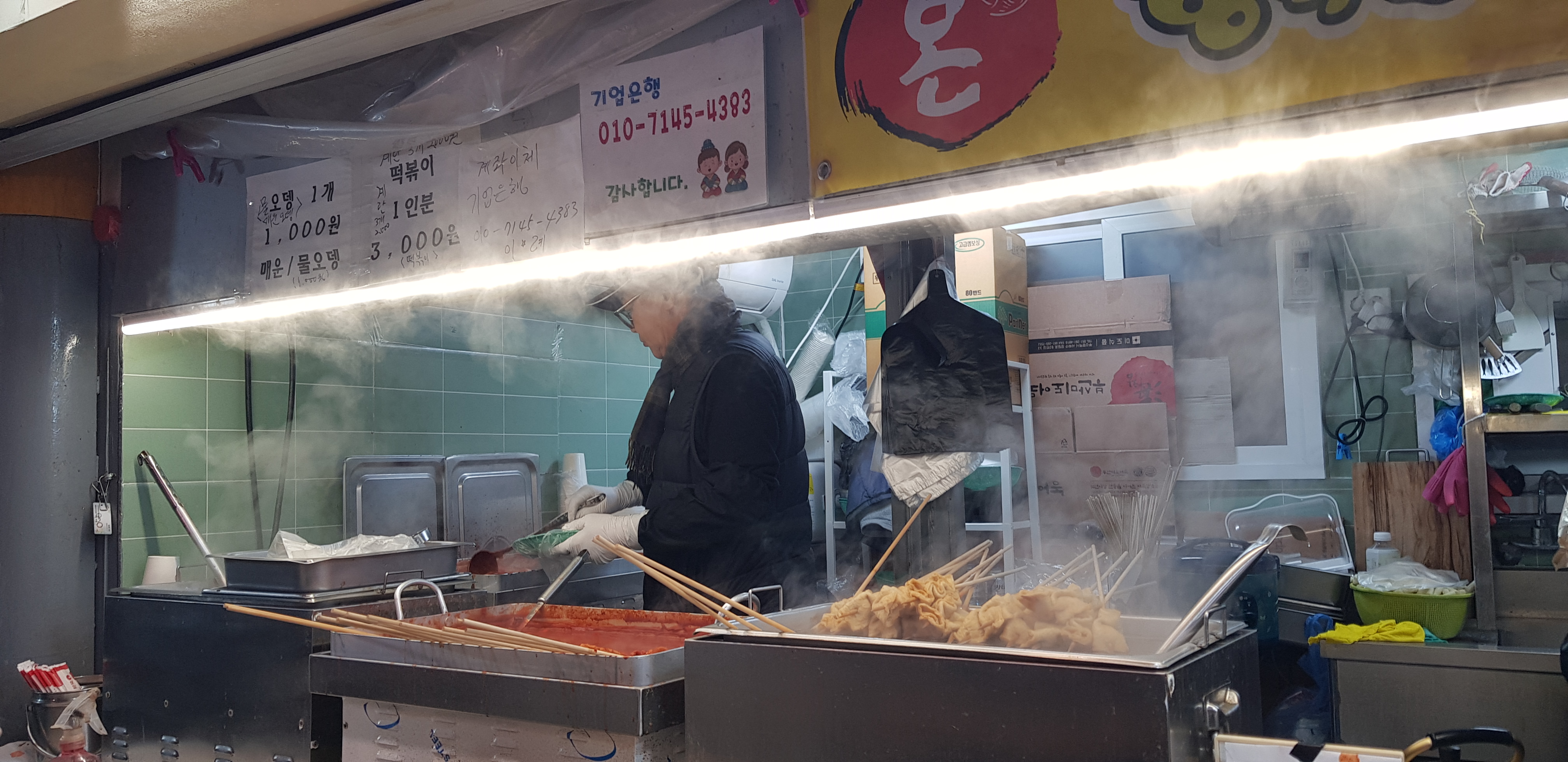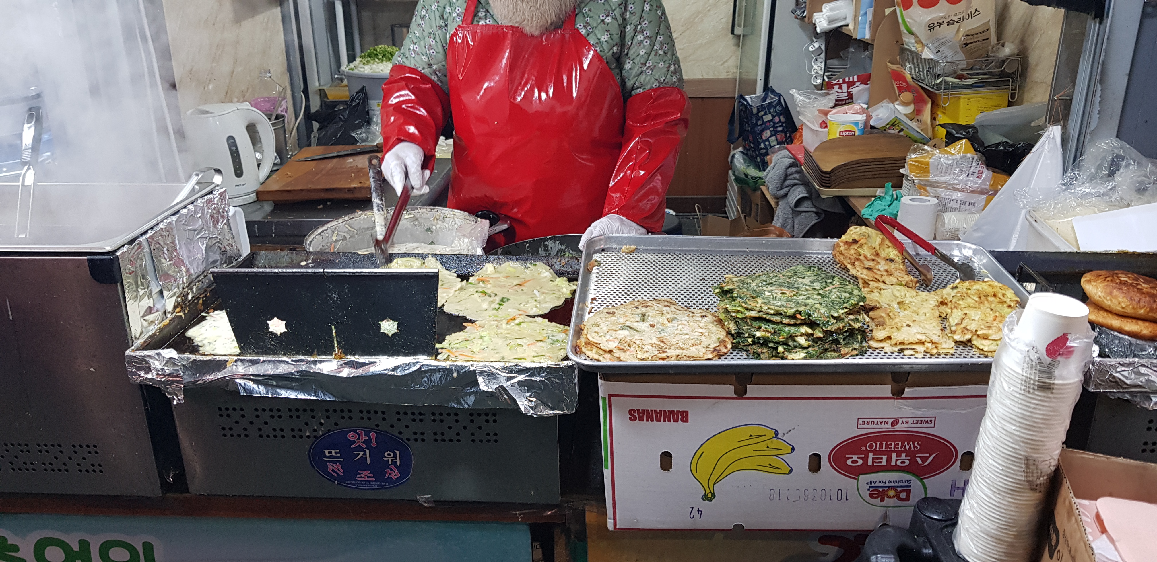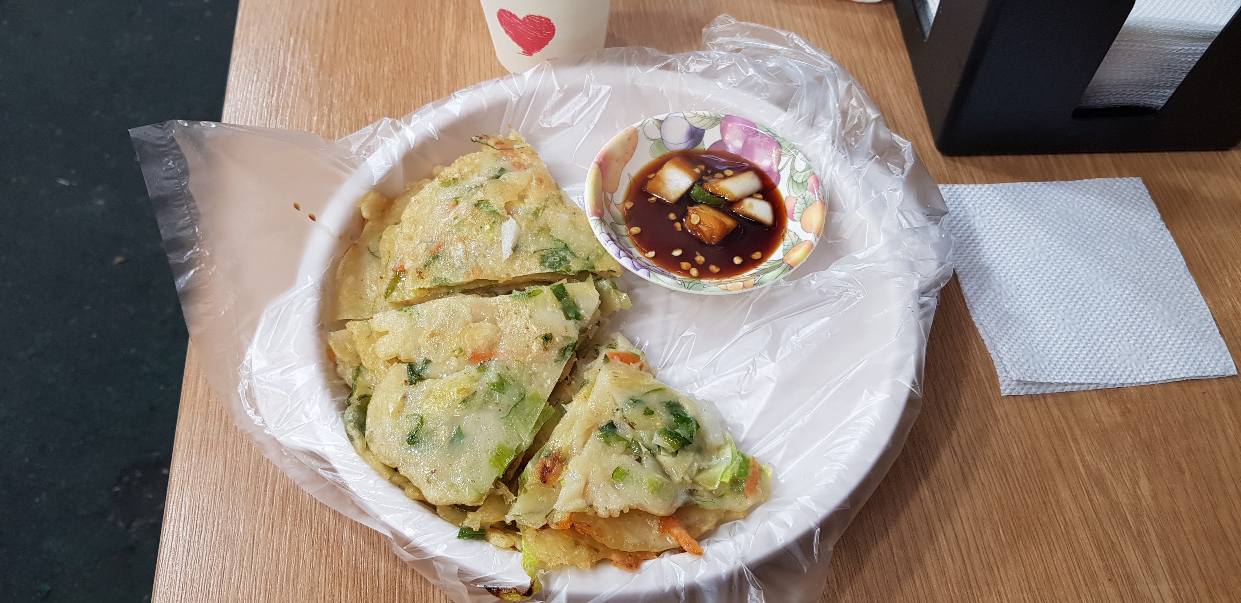 부침개와 배추전의 큰 차이는 없다. 부침개 한 장 크기가 절대 작지 않다. 단지 2000원 4장으로 배가 부를 정도이다. 회전율이 좋아 거의 항상 새로 부친 전을 먹을 수 있다. 사실 500원 부침개에 내용물을 크게 기대하지 않았다. 하지만 부추, 당근, 양파 같은 채소가 알차게 들어 있었다. 오뎅국물도 같이 내어 주신다. 주로 포장 손님이 많았다. 많지는 않지만 앉아서 먹을 자리도 마련되어 있다.